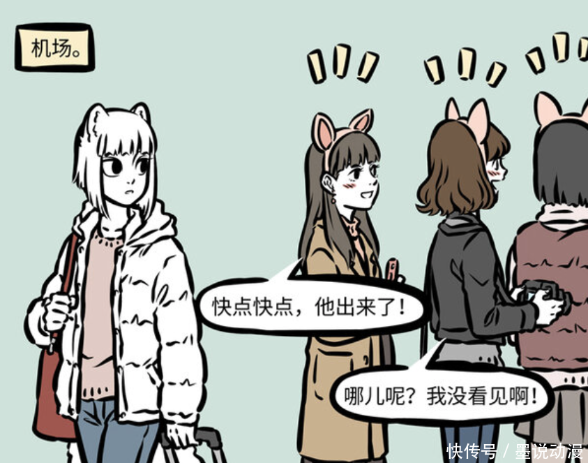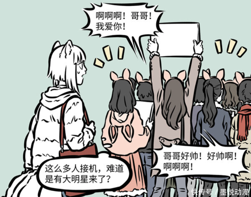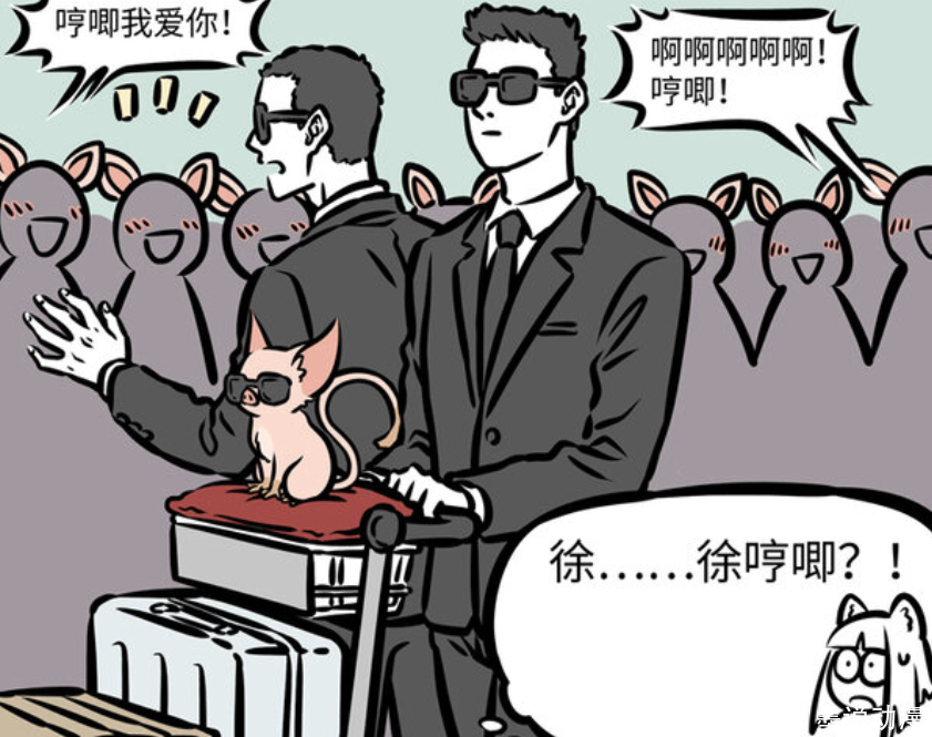《非人哉》漫画版,九月出差回来,刚下飞机,就发现有大批人在接机。九月本以为是什么大帅哥明星出现,结果发现了熟悉的身影。没想到徐哼唧成了大明星,身边还有保镖。在网上查了之后,九月才知道原来徐哼唧有众多代言,只是没想到他什么代言都接。