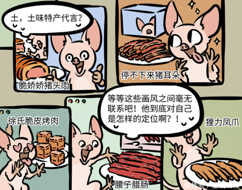 不仅如此,徐哼唧还代言土味特产,比如猪头肉、猪耳朵、脆皮烤肉等等。九月看到这里,不得不吐槽,这些画风之间毫无联系,徐哼唧到底给自己的定位是什么?另外代言猪肉、凤爪,看起来就像牛魔王代言牛肉一样。只能说徐哼唧风格百变,好好培养,那以后前途无量。